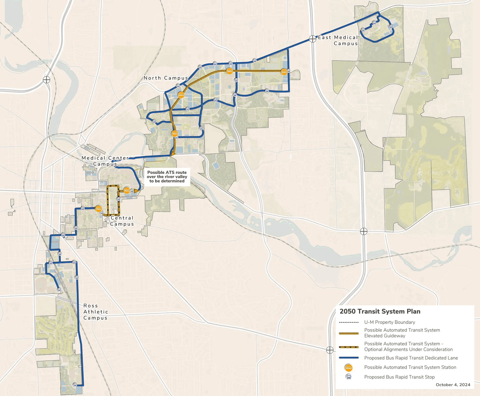 The University of Michigan 2050 Plan for an Automated Transit System. The system will connect the North and Central Campuses of the University of Michigan. The likely routing of the ATS in Yellow with Bus Rapid Transit system in Blue.