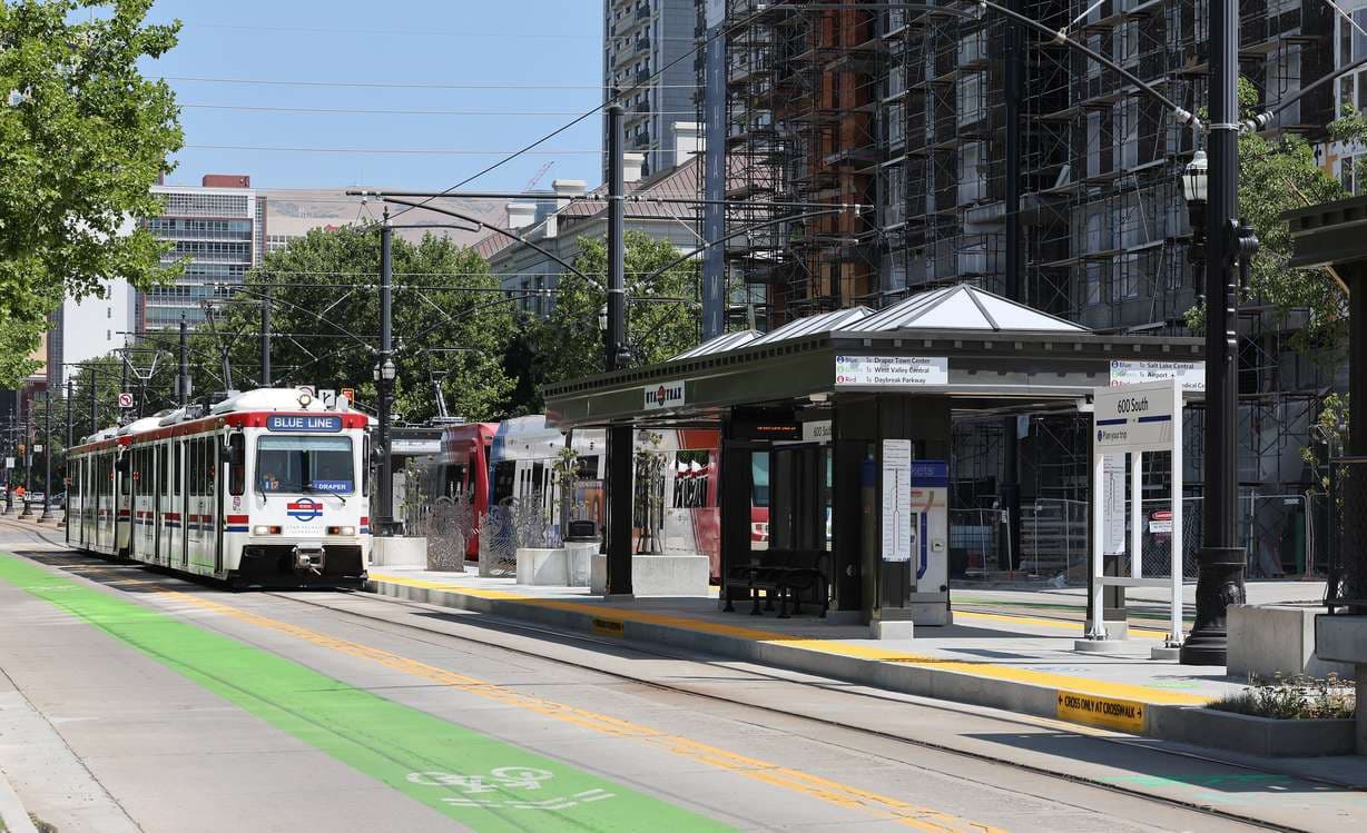 A Salt Lake City TRAX Light Rail Vehicle pulls into a station on the street. Notice the double yellow line to the vehicle's right, separating it from the car lane. This is a common design for street-running light rail systems. Neither the cars nor the light rail vehicles are slowed down by the other.